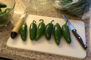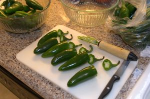 One caution before we start, jalapeno oil will burn.  You may want to use food safe gloves.  Regardless of using gloves or not, avoid touching your eyes after touching the jalapenos.  Wash your hands with soap periodically.