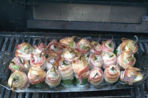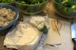 There are just a few ingredients in my stuffed jalapenos:  jalapenos, bacon, cream cheese and raw shrimp.  Toothpicks are useful in holding everything together, but my wife doesn’t really like me using them so I try to avoid it.